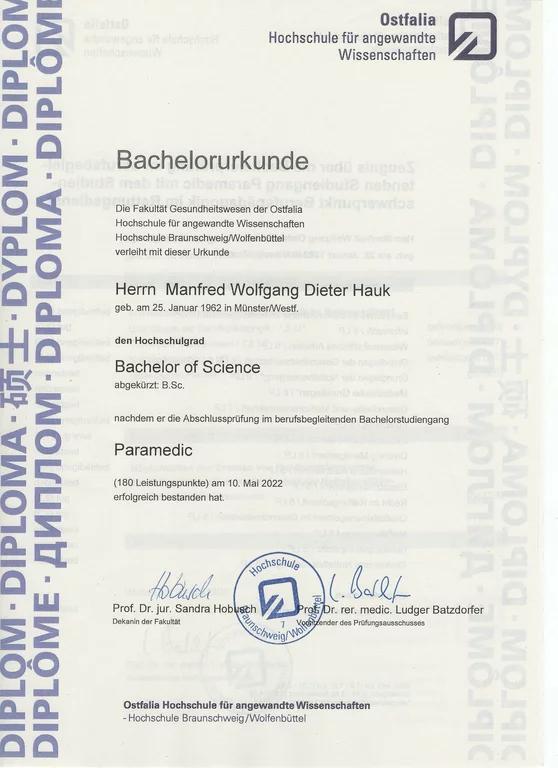 1989 Wechsel zum DRK Peine. Dank kontinuierlicher Fort- und Weiterbildung konnte ich bald Führungsaufgaben übernehmen. Desinfektor, Praxisanleiter (PAL), ORgL (Organisatorischer Leiter Rettungsdienst), Leitung der ORgL Gruppe, Dozent im RD, und Schließlich das Studium Management und Pädagogik im Rettungsdienst, das mit dem Paramedic B.Sc. 2022 abgeschlossen wurde.